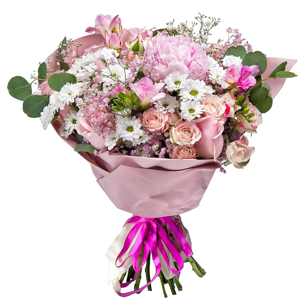 Хризантема кустовая, пион, роза кустовая, роза одноголовая, альстромерия, эвкалипт, гипсофила.